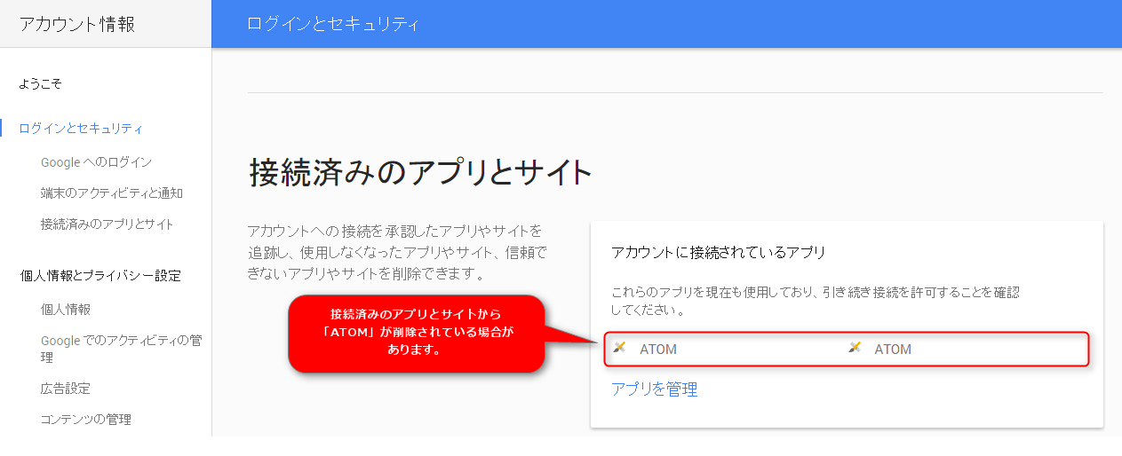 Googleアカウントの「アプリを管理」からATOMが削除されています。 再度、認証用URLにて代理店登録を行ってください。 参考:こちら →対処方法へ |