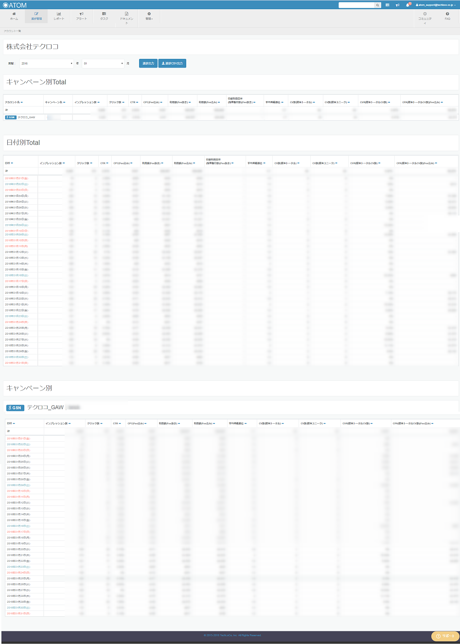 - クライアントに紐づいているアカウントすべての、キャンペーンごとの成果が表示されます。